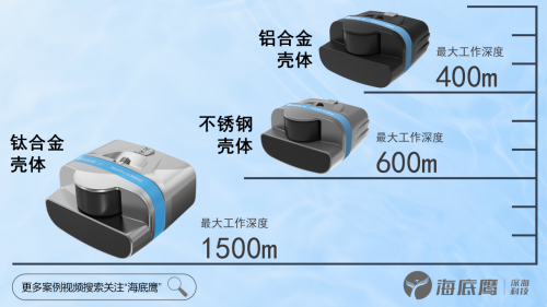 壳体材质可选配铝合金/不锈钢/钛合金,适配更多深水任务,最深可达1500米。