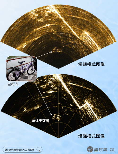 图像增强功能可以剔除绝大部分背景,更有利于单体目标探测和目标自动识别场景,尤其适合ROV、AUV前视避碰等场景,通过高亮显示辨别前方是否存在障碍物。